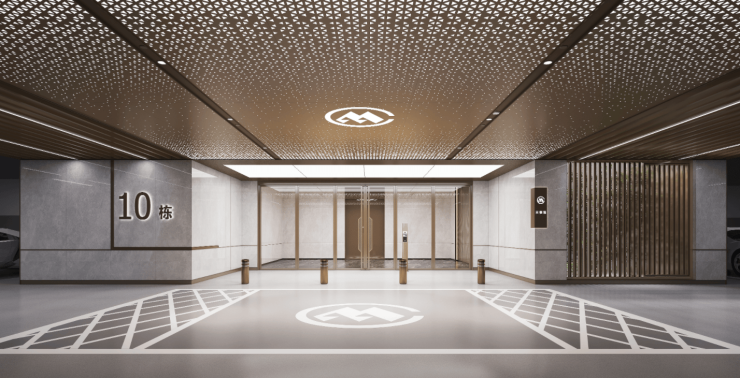 主入口采用门庭与景观一体化设计。超30米阔尺仪门与约5.6米挑高,采用深灰石材墙面与铝板顶饰,彰显尊崇气质;