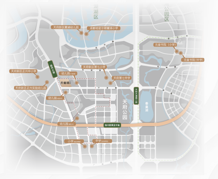 ⦿优享全龄教育 葆育孩子菁英未来约800米步行可达天府七中,天府七小,周边环伺天府八幼、哈密尔顿麓湖小学、元音书院、天府一小等名校,为孩子预定高起点人生。