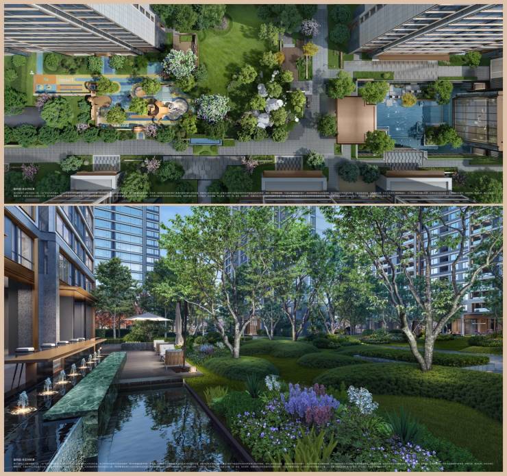 遵循十字双轴中庭景观排布,以水境艺术归家仪式轴、水岸林下森活景观轴,交融十幕水境生活场景。