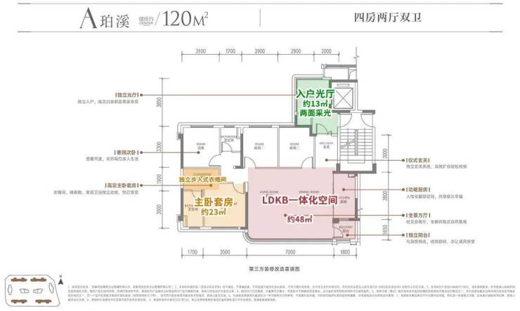 空间:约13㎡双面采光入户厅、约48㎡LDKB一体化动区、主卧套房+6㎡独立衣帽间。