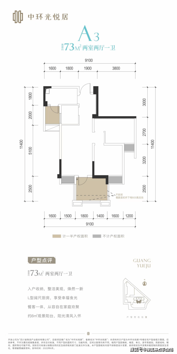 【项目基础信息】项目名称:中环光悦居,开发商:四川省物流产业股份有限公司,项目位置:四川省成都市成华区二仙桥东路60号,容积率:4.5,绿化率:20%,公摊:20%(赠送10%左右,得房率90%),车位数:365个,占地面积:10.58亩,梯户比:住宅3T8户,办公3T10户,总户数:住宅192户,办公80户,物业费:高层2.8元,办公4.2元,交房时间:2023年9月30日,产权年限:住宅70年,办公40年,物业公司:保利物业,产品面积段:62-73-83-91㎡,单价:2.1万左右