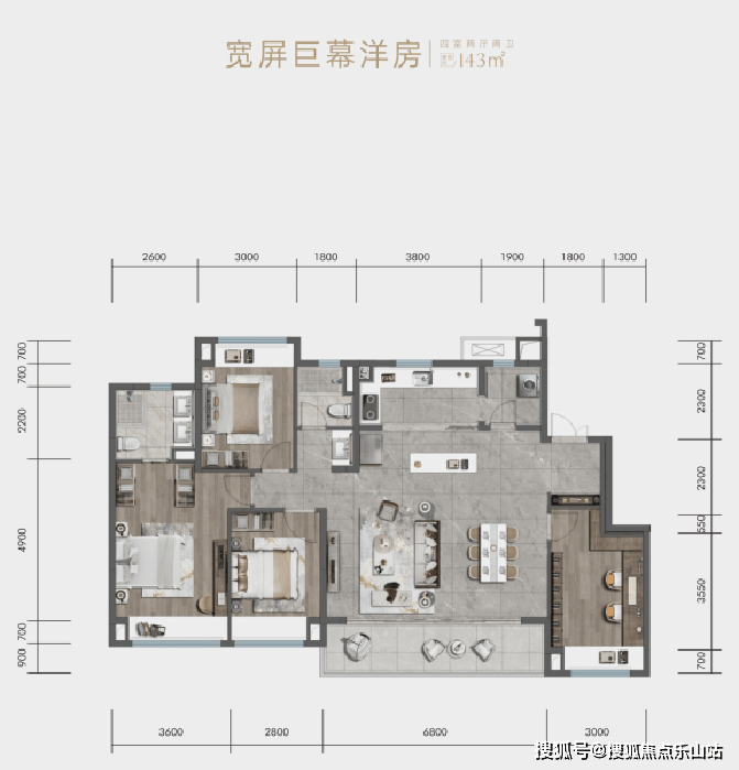 建面126-143㎡:宽屏板式设计,套房主卧,低公摊高得房率。