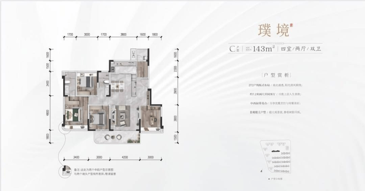 T2楼栋:中庭楼王(清水)?层高:16层、梯户比:2梯2户;板式布局⛩层高3.15米、一楼4.5米架空?公摊20.8%(全四房户型)【C璞静】:建面约143㎡,四房两厅两卫