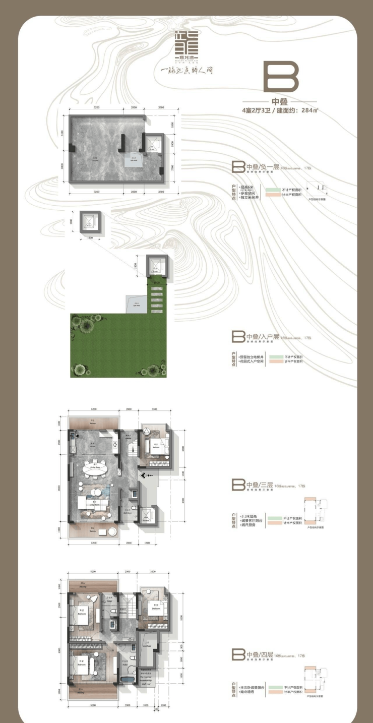 【基本信息】 总占地面积:42亩,容积率:1.5,绿化率:35%,总户数:184,物业费:4.9元/㎡,楼层总高:6+1,3,交付标准: 清水交付,交房时间: 预计2023年12月31日,产品面积:A户型 建面约235㎡~271㎡;B户型 建面约237㎡~284㎡;C户型 建面约209㎡~269㎡;E户型 建面约410㎡~470㎡