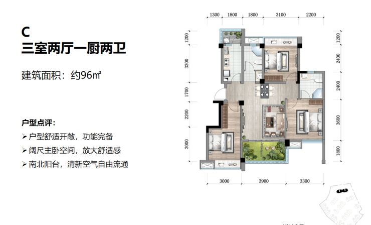 C户型面积96㎡套三双卫设计,前后通透,小区中庭楼王位置。总价75万