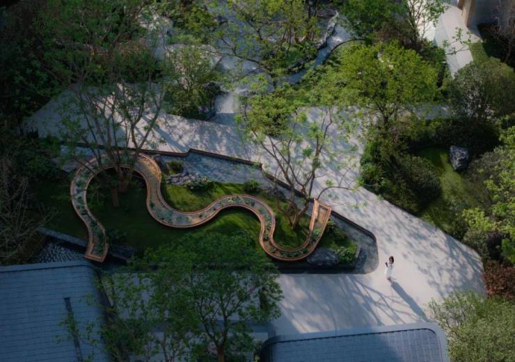 承袭川西“泗水归堂”礼序美学,打造48米归家门庭,融合编织纹青砖黛瓦与现代建筑语言。