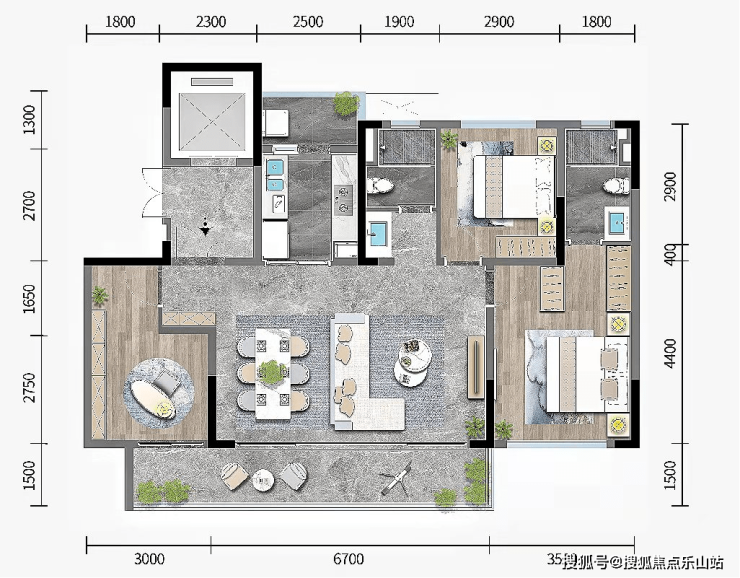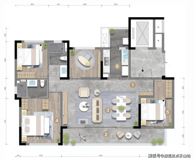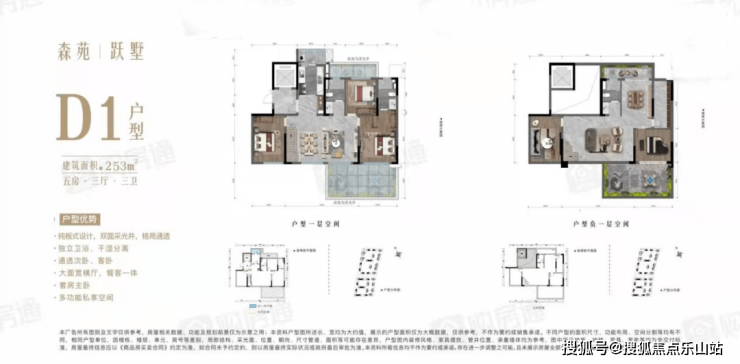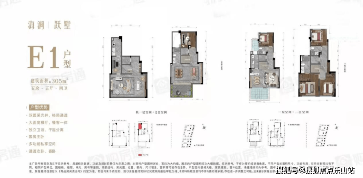 小高层建面约253-269㎡的双层底跃,多数户型一楼布局为三室两厅双卫,前后规划有赠送花园(面积暂未确定)。负一层空间面积超100㎡,通过双面采光井通风采光,但暗室仍不可避免。