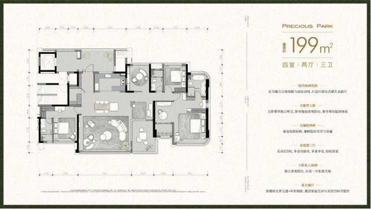 室内四花园设计:主城唯一“户内户外双花园”体验,如约183㎡户型配备约7米景观阳台。