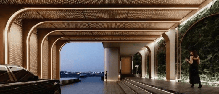 材质奢选: 甄选全球超15种珍稀石材(如莫奈绿曲面奢石、白玉冰裂纹石材、意大利蓝白奢石、黄虎眼石、绿野仙踪大理石等)铺陈65米超长门廊及归家路径;立面铝板统一采用“范戴克棕”,冠顶饰以水纹铝板,尽显奢华。