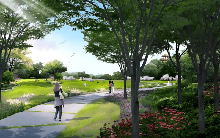 占地约500亩,向东北步行约300米即达,包含绿化、景观、绿道、配套设施等多个方面功能,可以满足老年人、儿童、青少年等全龄群体对公园绿地休闲娱乐的需求。