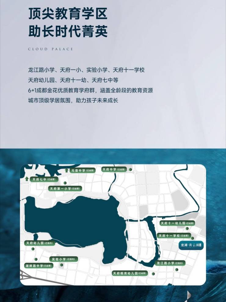 【湖居生活代表,稀贵高阶住区】青云阙是龙湖最新三大豪宅产品线之一,龙湖新一代东方奢宅。全国第十二座青云阙,天府青云阙,落址兴隆湖最强学区,继御湖境、云河颂之后补齐城南三大高端豪宅产品线的巅峰之作。