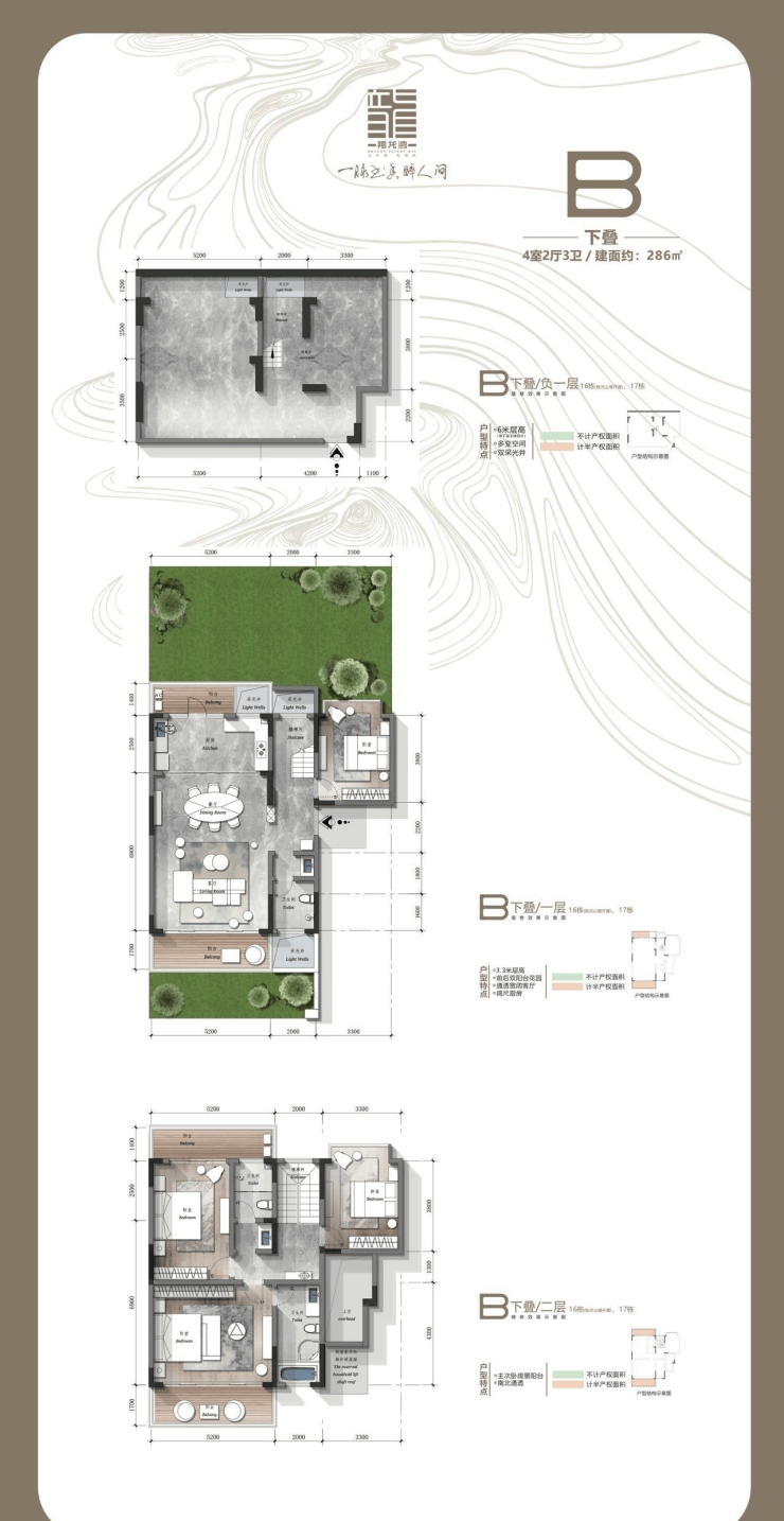 235㎡:四室三厅四卫,南北双庭院,独立家政电梯厅