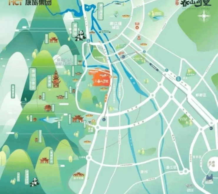 康旅集团以“梦享·春山可望”项目为契机,深度参与成都市“世界旅游目的地”建设进程,致力于为青城山片区商、住、游、购、娱等业态提档升级,填补景区度假旅居模式空白,扩大文旅融合创收经济规模。项目有机糅合居住生活、休闲游憩、旅游度假“三大生命空间”,采用一心一轴三环六脉的布局结构,涵盖高端酒店集群、精品民宿集群、特色商业小镇等丰富业态,形成了吃住游玩购五位一体的生态圈,通过提供住宿、餐饮、购物、休闲、玩乐等一体化设计规划,为景区构建了一个可投资、可度假、可经商的旅居度假经济生态圈,将“流量”转为“留量”,让青城从此无过客。