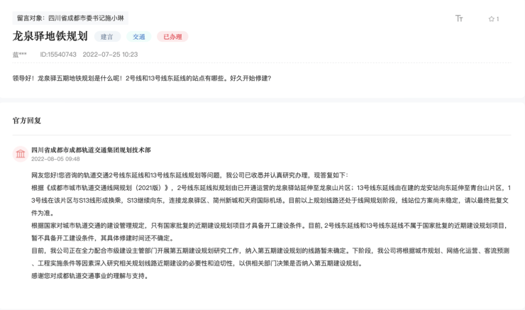 两横一纵路网 通达城市全域成龙大道(成简快速路)、天府机场高速、五环路(2023年全线通车);地铁2号线、13号线(在建)、市域铁路S13线、S15线等轨道交通;851、571等十余条公交线路覆盖。