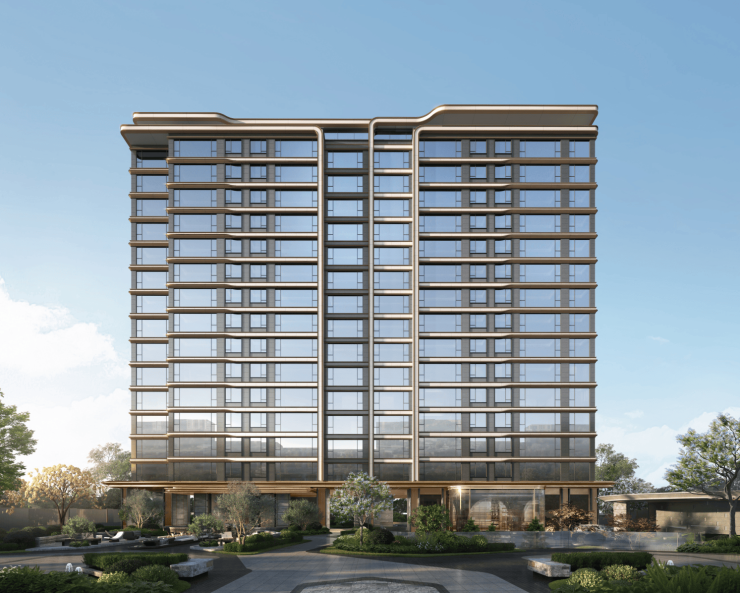 以锦江水流灵感,萃取蜀锦华贵底蕴,打造流线外立面+香槟金线条,呈现精奢立面