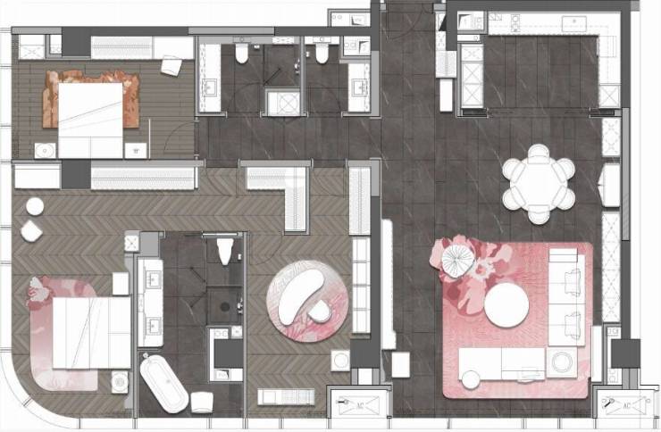 D户型居其——戴昆设计,汲取芙蓉花灵感,打造室内精装,在点题芙蓉花的基础上,突出与新国潮理念的融合,使之兼具现代与未来感,超250㎡的空间尺度体验。78㎡的宾利式餐客厅,68㎡的全景落地窗浪漫主卧。