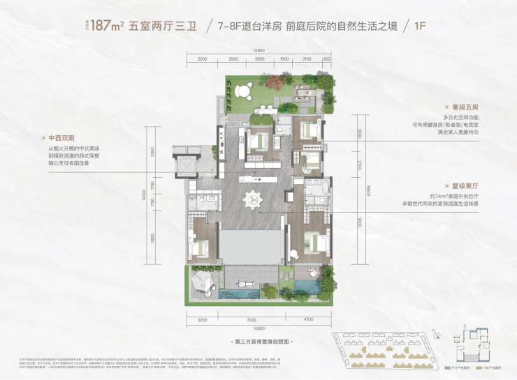 小区大门打造宽50米,搭配两道15米仪仗景墙将尊崇礼序与高雅审美融入园林设计,铺展五进院落规制,归家之路如游桃源之境。沿尊享仪式轴与悦享生活轴,十二大园林空间散落其间,以全龄段多功能主题场景承载圈层生活雅趣,更匠心雕琢景墙、屏风等细节,臻选树王、花林等名贵植被,演绎对品质生活的严苛追求。