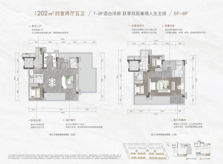 项目占地110亩,容积率仅1.5,由27栋7-9F纯洋房构成,总户数:779户。小区以阵列式布局为主,南北纵深大楼间距约150m,东西向纵深大楼间距约350m。所有产品均为通透的板式真洋房,打造面积116㎡/136㎡的观境洋房和135㎡~202㎡退台洋房。全线产品皆为四房以上真洋房产品,以对当代改善生活方式的深度洞察,将动线格局、观景视野、居住尺度、空间功能等越级呈现,进一步延展生活的奢适度。