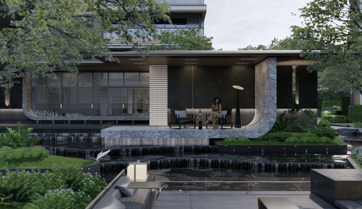 金玉廊庭 心入自然对景中庭漂浮于叠水之上,以中式廊架交融林间自然水景,光影配合秩序而律动的线条,延伸东方文化的生活遐想。
