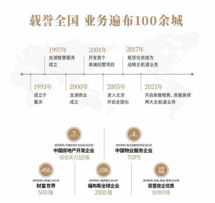 龙湖于1993年成立于重庆,中国地产综合实力排行TOP10,总部设立在北京朝阳区,业务涵盖地产开发、商业运营、智慧服务、冠寓、装修等