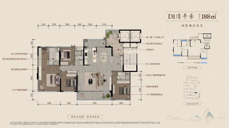 低密改善:2T2纯板式结构,层高3米,户型南北通透,191㎡端厅设计享270°景观视野。