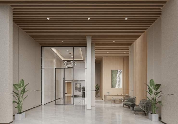 首层入户大堂采用了精装交付,层高约6米,整体风格为现代简约,通过顶部和墙面格栅、装饰线条的设计,再加上软装的搭配,进一步提升了整体质感。