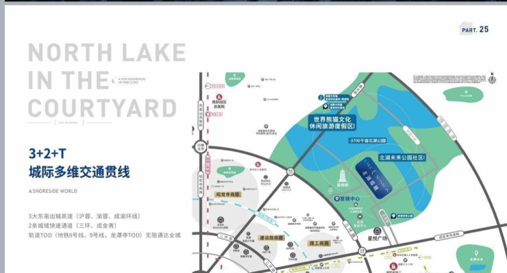 【区域背景】全市首批启动建设的25个未来公园社区之一,北湖未来公园社区预计将于两年内完成生态景观打造,三年内首期全面建成投运。◇ 生态本底:北湖未来公园社区位于环城生态公园最大绿楔区域,总面积556公顷,该片区伴山伴湖半城林,规划绿地面积298公顷,建成后人均可享受绿地面积45.6平方米,是国家最高标准的3.8倍。◇ 产业优势:北湖未来公园社区突出大熊猫和北湖生态双IP,将文创会展、国际度假和国际商务作为主导产业,着力塑造产城融合、职住平衡、功能集成、场景互动的产业型未来公园社区。◇ 开发空间:北湖还有大量可开发用地和场景承载。据悉,该片区土地储备充足,征地拆迁基本完成,可开发建设用地206公顷,具备打造未来公园社区的承载空间。◇ 交通牵引:北湖三横两纵三轨的交通配套已趋近全面成熟。根据成华区深入实施“中环牵引、纵横联动、组团优强”发展策略,三环路、蜀龙大道、成华大道、成安渝高速等几条横纵交错的主干道,合力形成的综合交通枢纽。