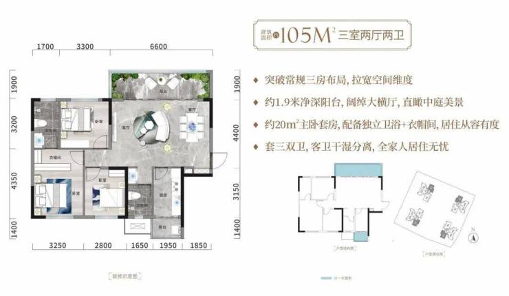 户型亮点:建面约105㎡套三双卫,几乎零浪费空间,主采光面朝中庭,运用LDK一体化设计手法,面积达到了约41㎡,占了整个房间约40%面积。同时,LDK厅与厨房、生活阳台形成空气对流,提高整个房间的采光和通透性;超20㎡的主卧,套房设计,还预留有衣帽间的位置,在同级别建面中,也是极为少见的!