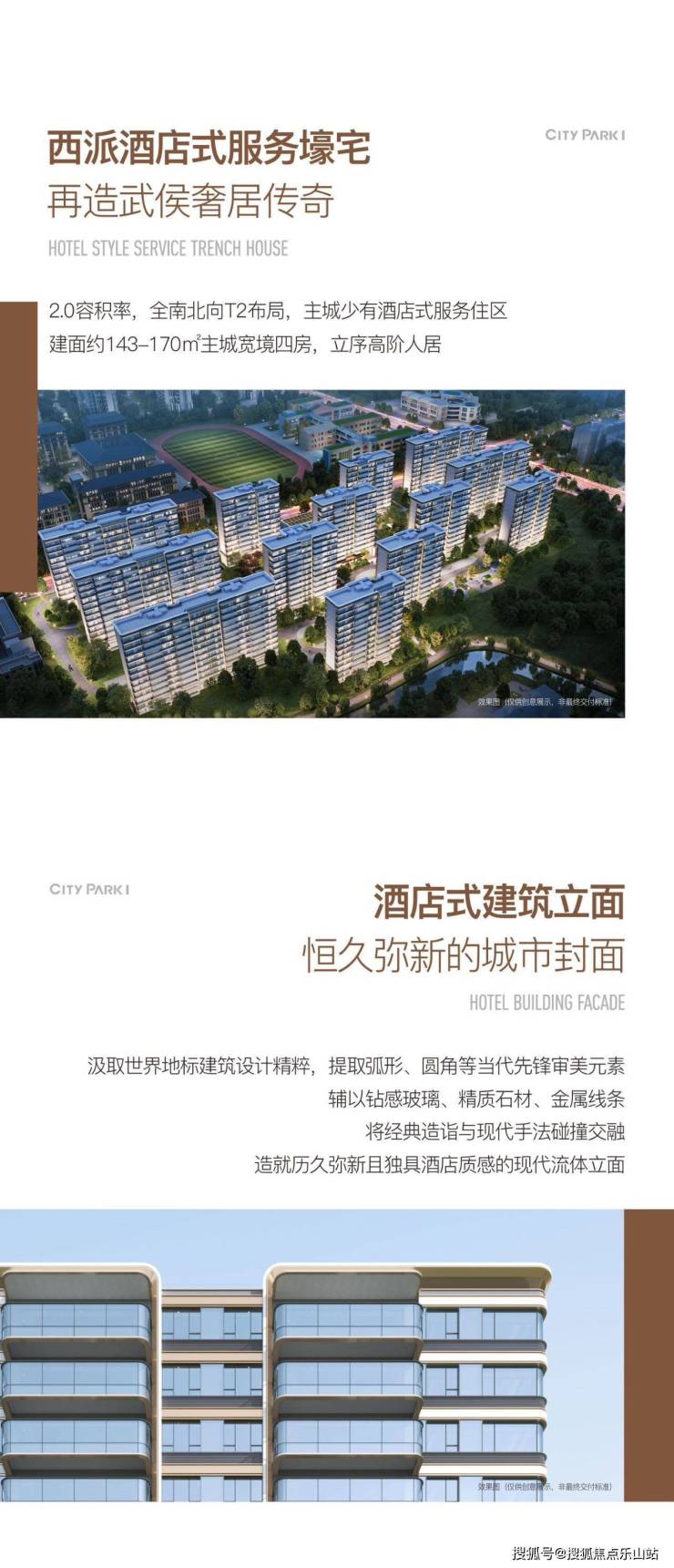 汲取世界地标建筑设计精粹,提取弧形、圆角等当代先锋审美元素,辅以钻感玻璃、精质石材、金属线条,将经典造诣与现代手法碰撞交融,造就历久弥新且独具酒店质感的现代流体立面(非最终交付标准)