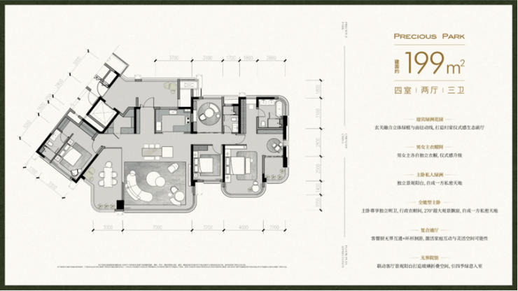 花园平层革新:全户型配置独立花园,室内景观中轴+四花园设计,可改造为5房,满足全生命周期需求。