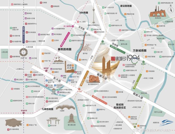 【核芯区位】立于中芯,划定一公里烫金生活圈成都饭店·锦城印1984项目位于东一环、蜀都大道两大城市中轴交汇的核芯处,处于东西轴线门户位置,占位城市核心地段C位,稀缺臻贵、不可复制。