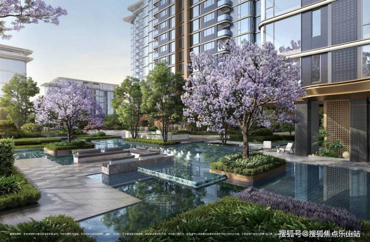 软景中水景占比约14%,媲美百亩级大盘水景规划引水入园,打造三大中庭水景,总计约1400㎡水系面积。甄选紫薇、泰山油松、蓝花楹等全球名木,匠造九章景观节点。