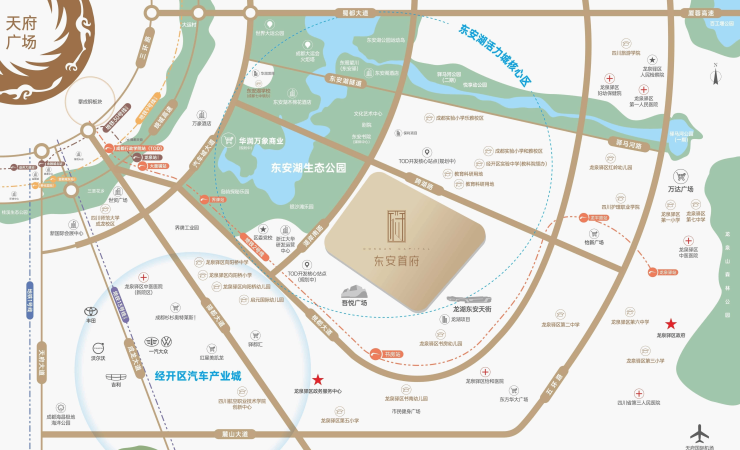 项目位于东安湖核心瞰湖C位——南岸中央CAZ活力区,北揽约5061亩东安湖,南拥约20万方商业综合体龙湖天街+吾悦广场,片区内已集聚文化艺术中心、剧院、图书馆等重大功能设施;是板块中发展最为成熟,呈现度最高的区域,是全天24小时的活动中心和活力中心。