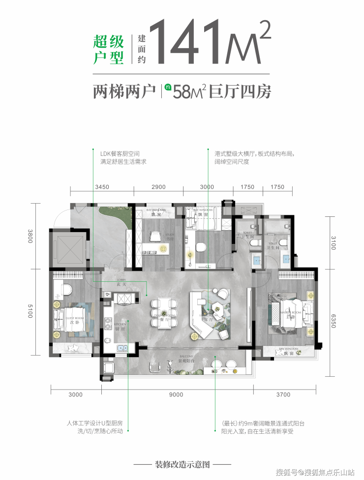 升级10:优良的空间考量:在原有的户型基础上升级迭代,打造城西超级户型,约141m²四房,约58m²巨厅,两梯两户,私家入户花园。