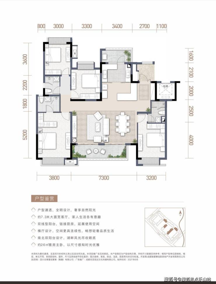 【纯板式结构,围合式布局】:板式结构通透设计,南北通透;围合式布局,约65米超宽楼间距,空间最大化确保私密性和宽阔视野