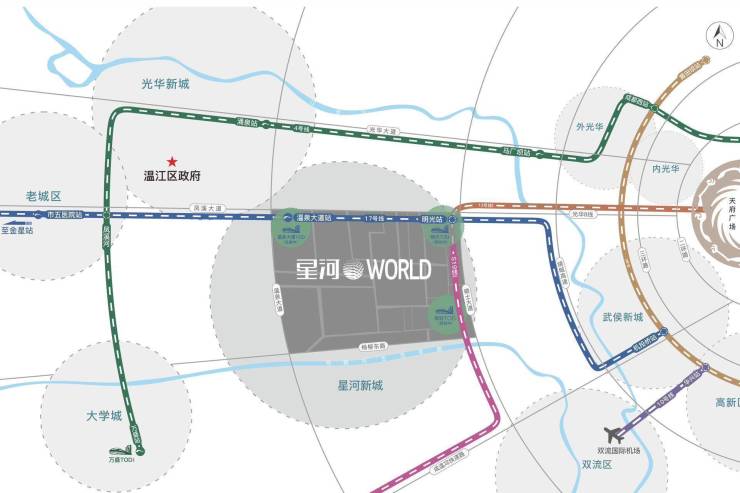 三轨∶4、17、13号线(规划中)环绕,距离17号线温泉大道地铁站约500米。