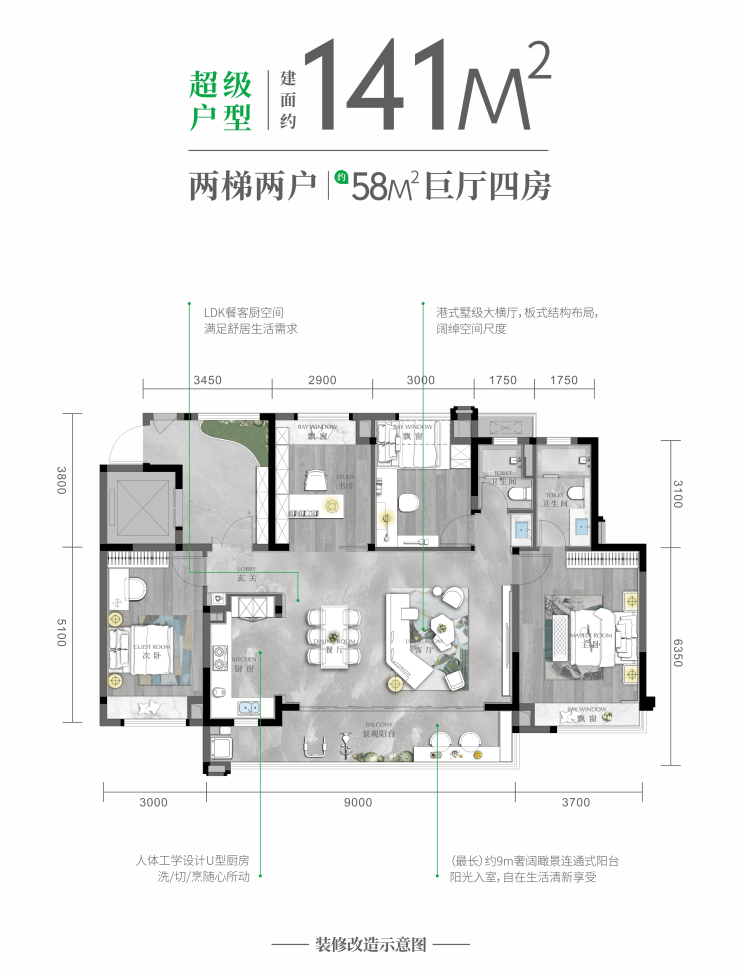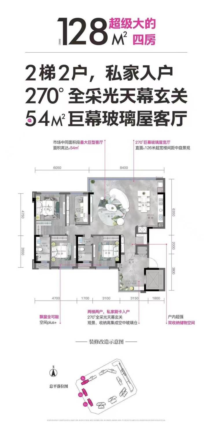升级10:优良的空间考量:在原有的户型基础上升级迭代,打造城西超级户型,约141m²四房,约58m²巨厅,两梯两户,私家入户花园。