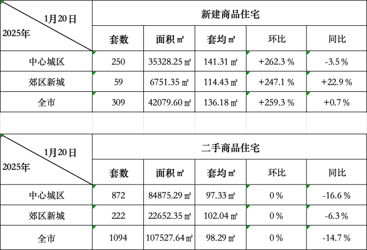 成都2025年1月20日新建商品住宅全市成交套数309套、共计面积42079.60㎡、套均136.18㎡、环比+259.3%、同比+0.7%;(其中中心城区成交250套、共计面积35328.25㎡、套均141.31㎡、环比+262.3%、同比-3.5%,郊区新城成交59套、共计面积6751.35㎡、套均114.43㎡、环比+247.1%、同比+22.9%).