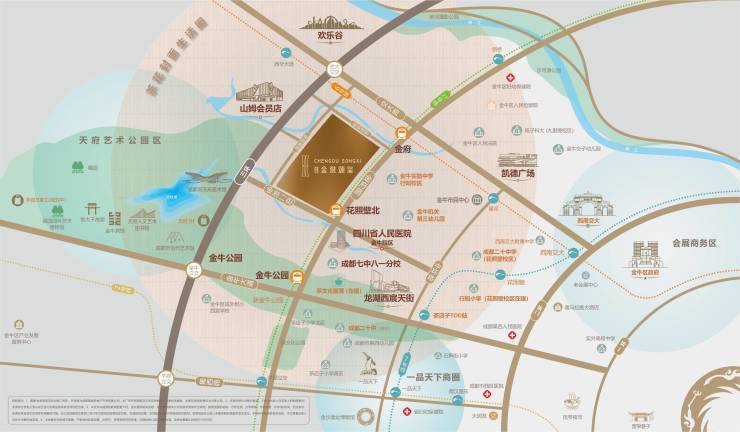 茶花板块在交通、教育、商业、生态、医疗等核心配套方面均表现出显著优势,并吸引高能产业与高素质人群聚集。自“全域北改”启动以来,板块持续进阶:新金牛公园重塑生态界面,金牛大道全面升级,地铁2、6、7、27号线四轨交汇;龙湖西宸天街与凯德广场构成“双商业核心”,茶店子小学、七中万达等优质教育资源云集,资源能级居板块前列。