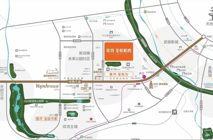 路网:双楠大道、星空路双主干道环伺,5公里接驳武侯万达,8公里直达双流国际机场。