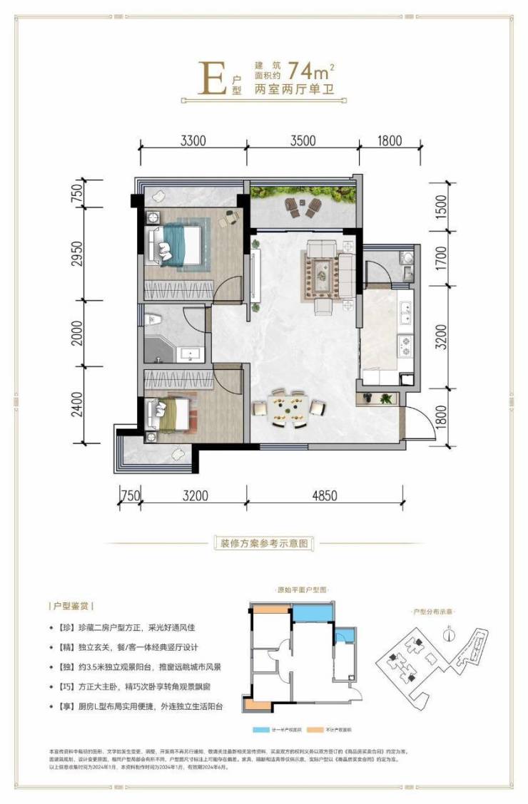 1.小面积:建面约74-105㎡ 套二/套三 稀缺套二与舒适套三