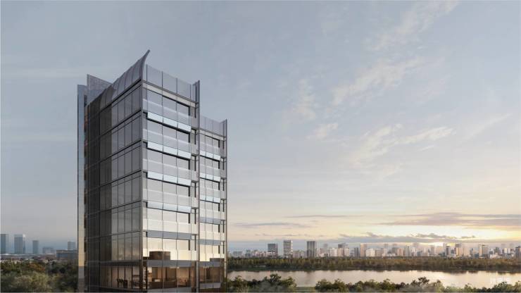 幕墙肌理:建筑立面玻璃包裹超90%以上,天然奢石竖向装饰,打造漂浮湖面的光幕之舟。