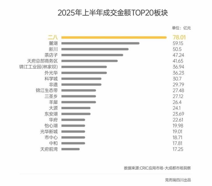 据克而瑞四川统计,从板块产值来看,2025年上半年二八板块成交78.01亿,贡献了成都楼市超6%的成交总额,为上半年最吸金的板块之一。截至6月2日数据显示,二八板块新房住宅成交超1969套、成交面积24.75万方,高居大成都板块新房成交套数/面积销量榜TOP1!(数据来源:克而瑞四川)