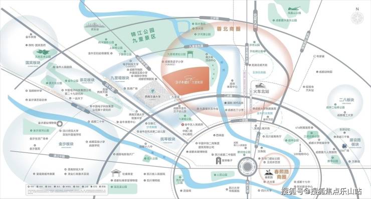 三纵一横路网(【三纵】交大路、九里堤路、蓉北商贸大道;【一横】二环);5条地铁线、多站点环伺(周边地铁站7号线,6号线西南交大站,5号线,1号线,另有18号线火车北站在建),复合交通网保障高效出行。