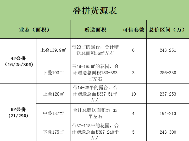 叠拼产品详情:1、4F悠云A(下叠) 建面约193㎡ 四室两厅三卫(赠送面积约:190-330㎡)