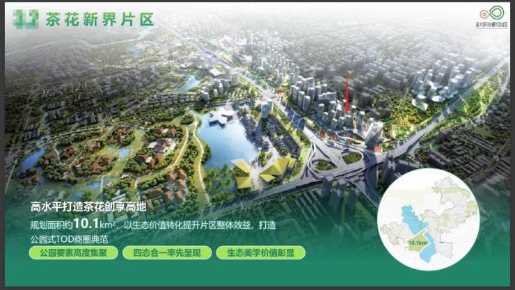 茶花新界片区:规划面积约10.1k㎡,以生态价值转化提升片区整体效益,打造公园要素高度集聚、四态合一率先呈现、生态美学价值彰显的公园式TOD商圈典范。