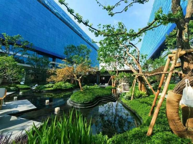 约110m 仪式美学中轴 ,3 条生活归家轴线,以镜面水景为主铺陈水景的「湖镜」「涌泉」「叠水」「流瀑」四种形态,设置环绕式水上会客厅、水中浮岛、单元迎宾水景,以现代酒店度假为基础,融入现代时尚元素,打造定制级的自然景观。