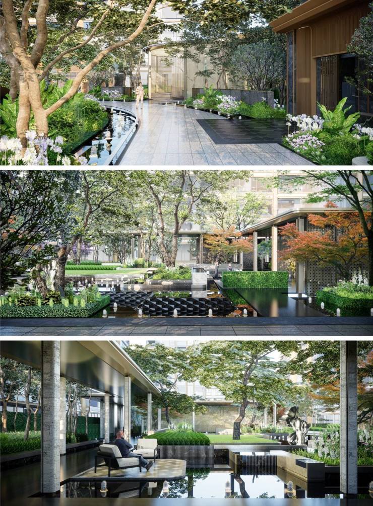 项目更匠心甄选多样植栽——延展视野的如茵草坪、层次丰富的雅致灌木,至全冠移植的挺拔乔木,与现代建筑相映成趣,于方寸间谱写自然、艺术与水的交响,诠释大美居境的生命力。