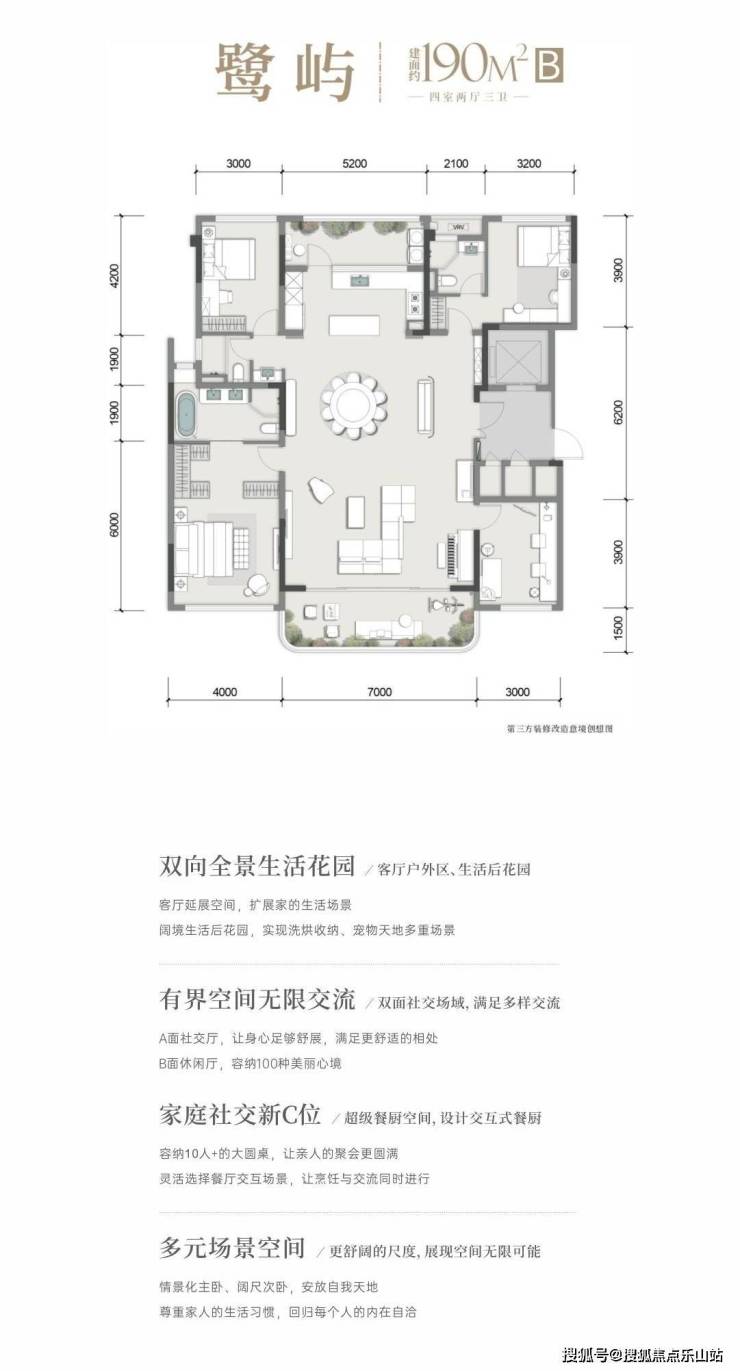 室内场景化功能尺度满配,有限空间无限交流为主城西家庭生活方式定制,超级餐厨空间容纳10人+的大圆桌,让亲人的聚会更圆满:双面客厅生活,A面社交B面休闲;情景化主卧、阔尺次卧,让每位家人均享受舒适生活
