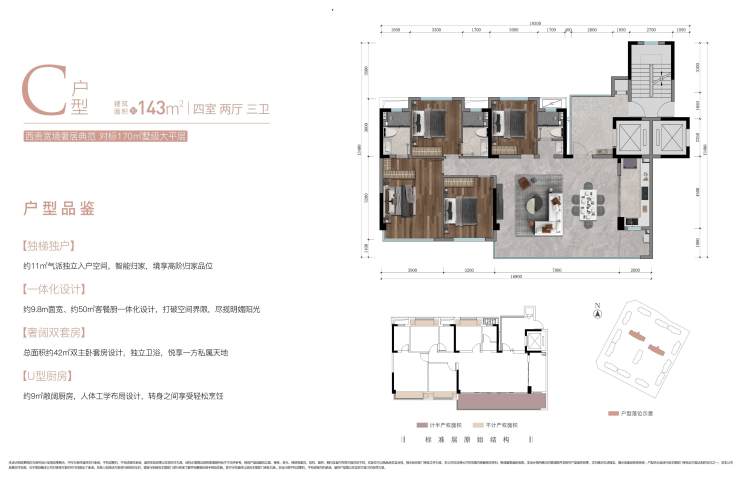 4、C户型143平米赠送面积:30㎡(含入户前厅)、得房约173㎡